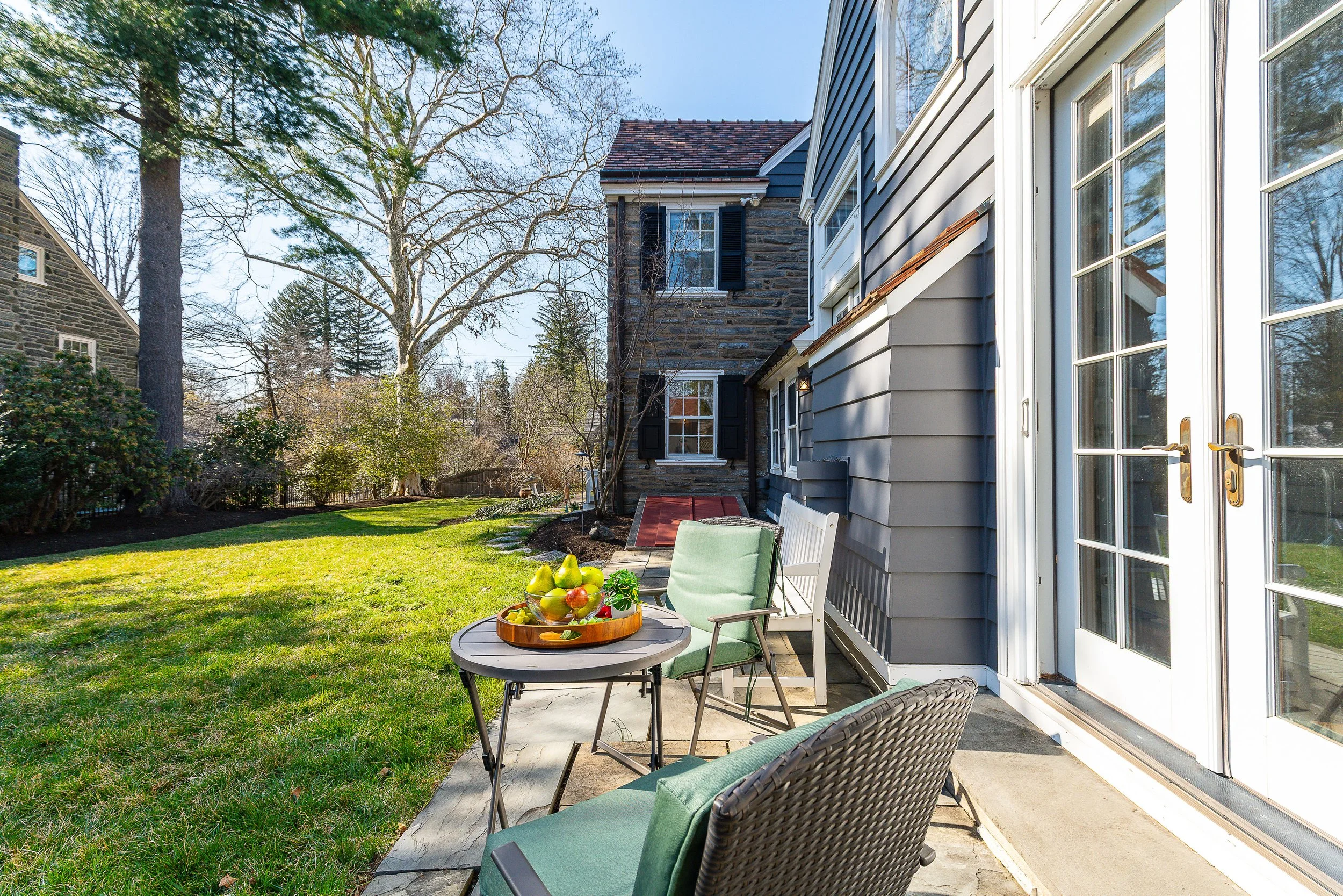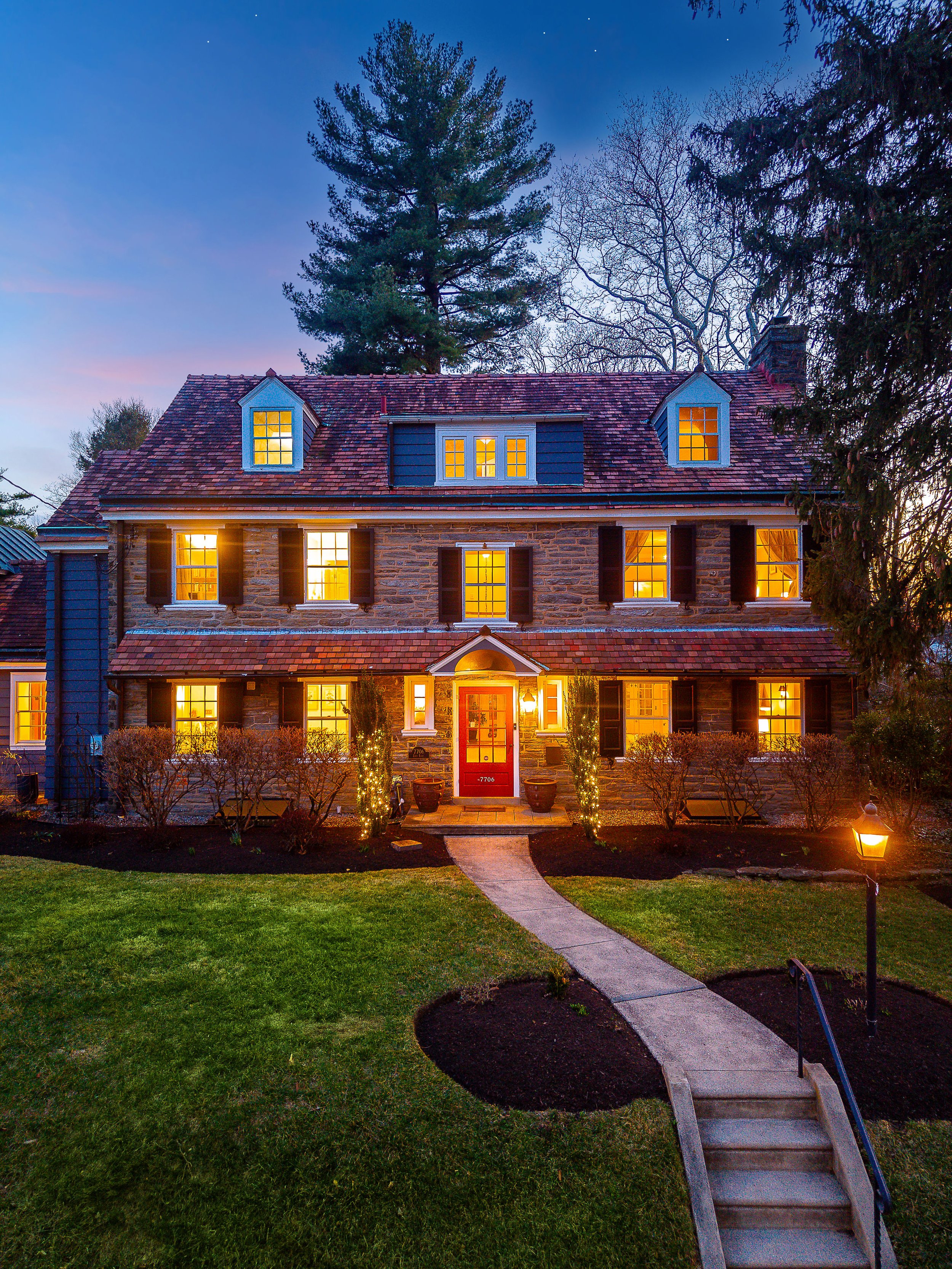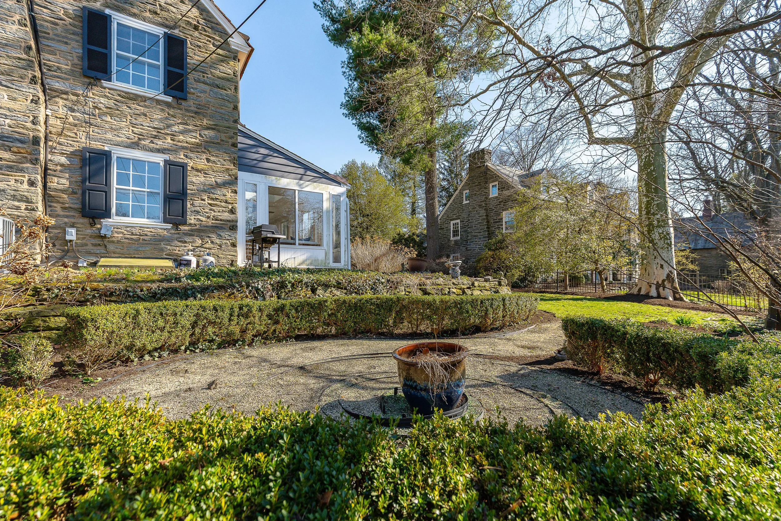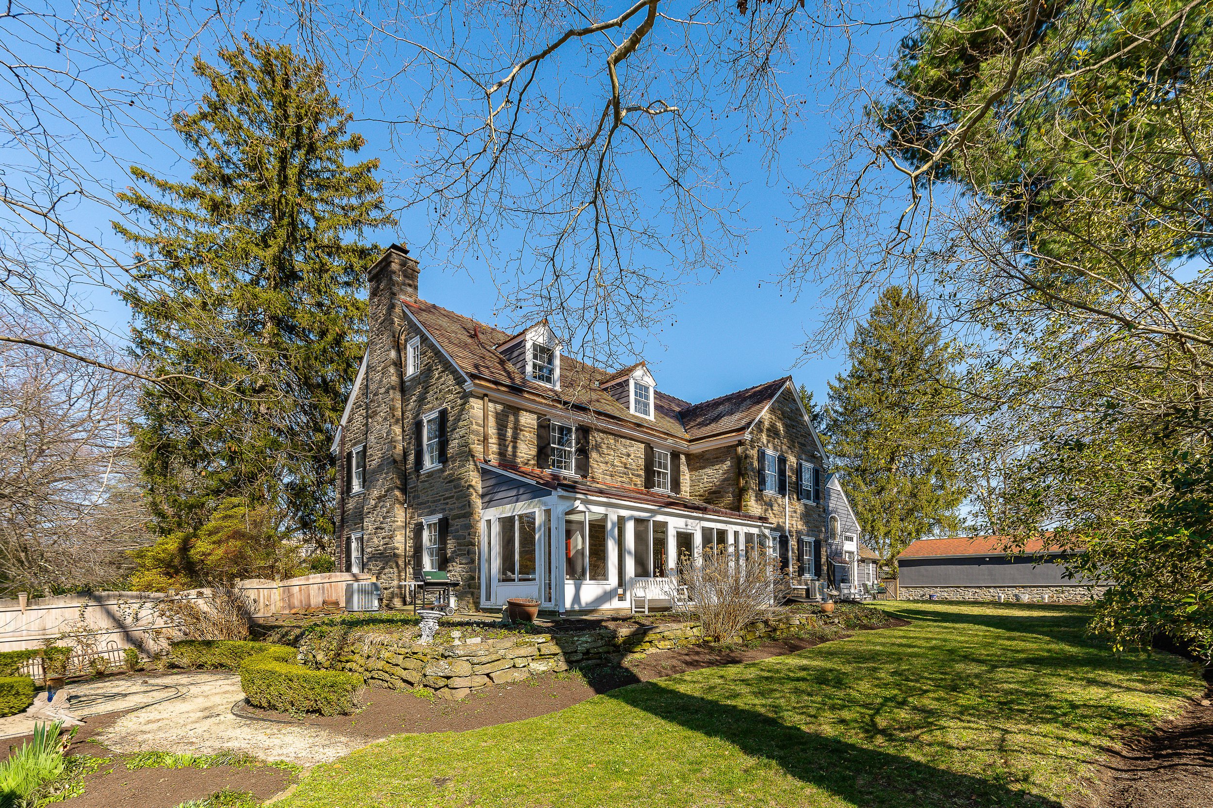 Set on a quiet, elevated lot in one of Wyndmoor’s most desirable locations, this beautifully maintained 1928 center hall stone Colonial offers a rare combination of timeless architecture and thoughtful modern updates. The home blends original character, including detailed millwork, elegant proportions, and a center hall stunning staircase, with meaningful improvements such as zoned heating and central air conditioning. The main level flows effortlessly, featuring a gracious formal living room with fireplace and built-ins, a beautifully proportioned dining room, and a bright enclosed three season room overlooking the garden and yard, creating an ideal space for relaxing or entertaining. The recently updated kitchen features white cabinetry, dark stone counters, a large center island, gas cooking with stainless hood, double wall ovens, and an open, functional layout that flows into a dramatic two story family room with custom built-ins, historic stained glass detail, and direct access to the backyard. A mudroom entry from the driveway connects seamlessly to the home and is complemented by two powder rooms on the first floor. Additional first floor spaces include a spacious laundry room and flexible options for home office or everyday living. The second floor offers a well appointed primary suite with large custom dressing room and a large bath with heated floors, along with two additional large bedrooms and a hall bath, plus a unique loft space overlooking the family room, accessed through a tucked away passage, offering a perfect setting for a reading nook, play space, or quiet retreat. The third floor provides two more bedrooms and a full bath, offering excellent flexibility. The finished lower level adds valuable living space with a recreation area, workout room, workshop, storage, and direct access to the yard. Outside, the property features a patio, level lawn, and thoughtfully designed garden areas including raised beds and a charming spiral garden. A custom oversized four car detached garage with HVAC, Swisstrax flooring, and built-in storage adds versatility for cars, hobbies, or workspace. Located within the highly regarded Springfield Township School District and just minutes from Wyndmoor’s town center, Chestnut Hill, the Wissahickon, and regional rail access to Center City, this is a rare opportunity to own a truly special home.