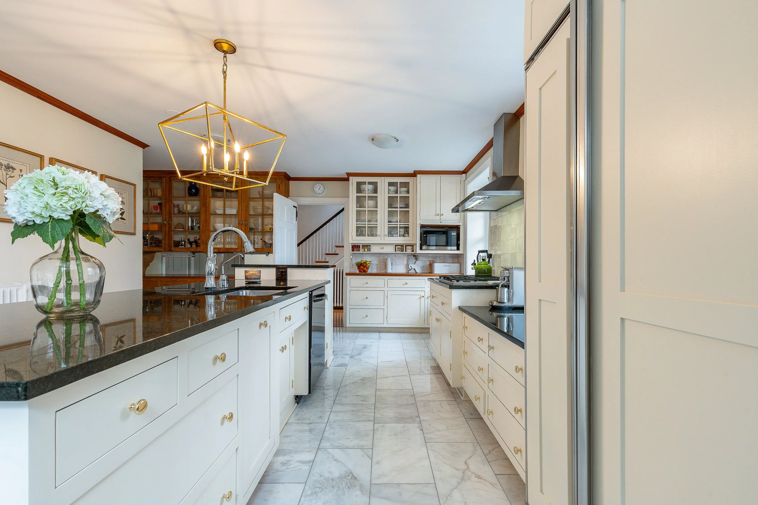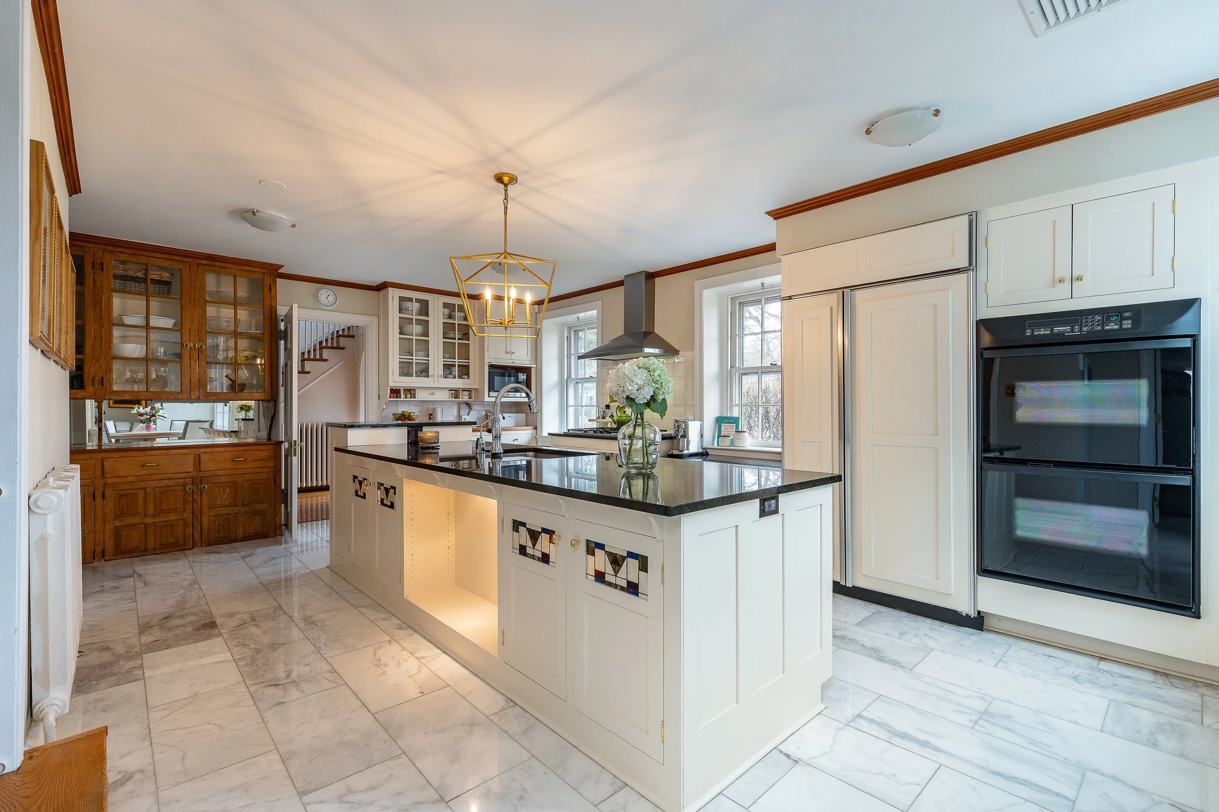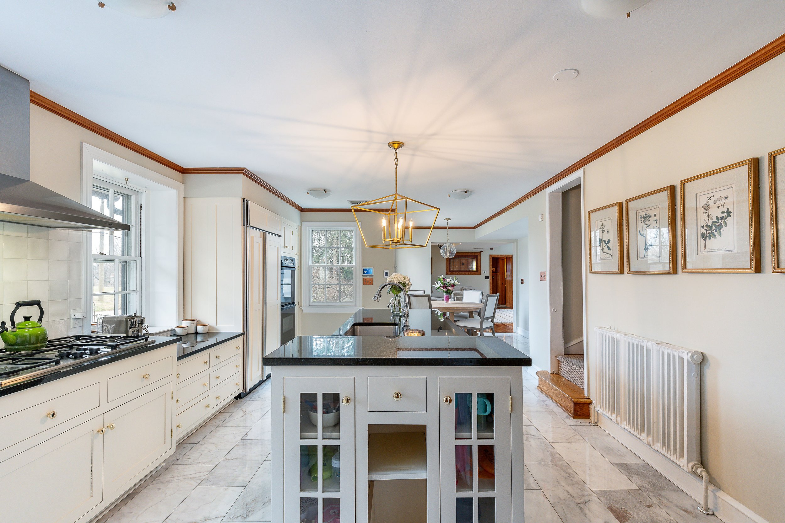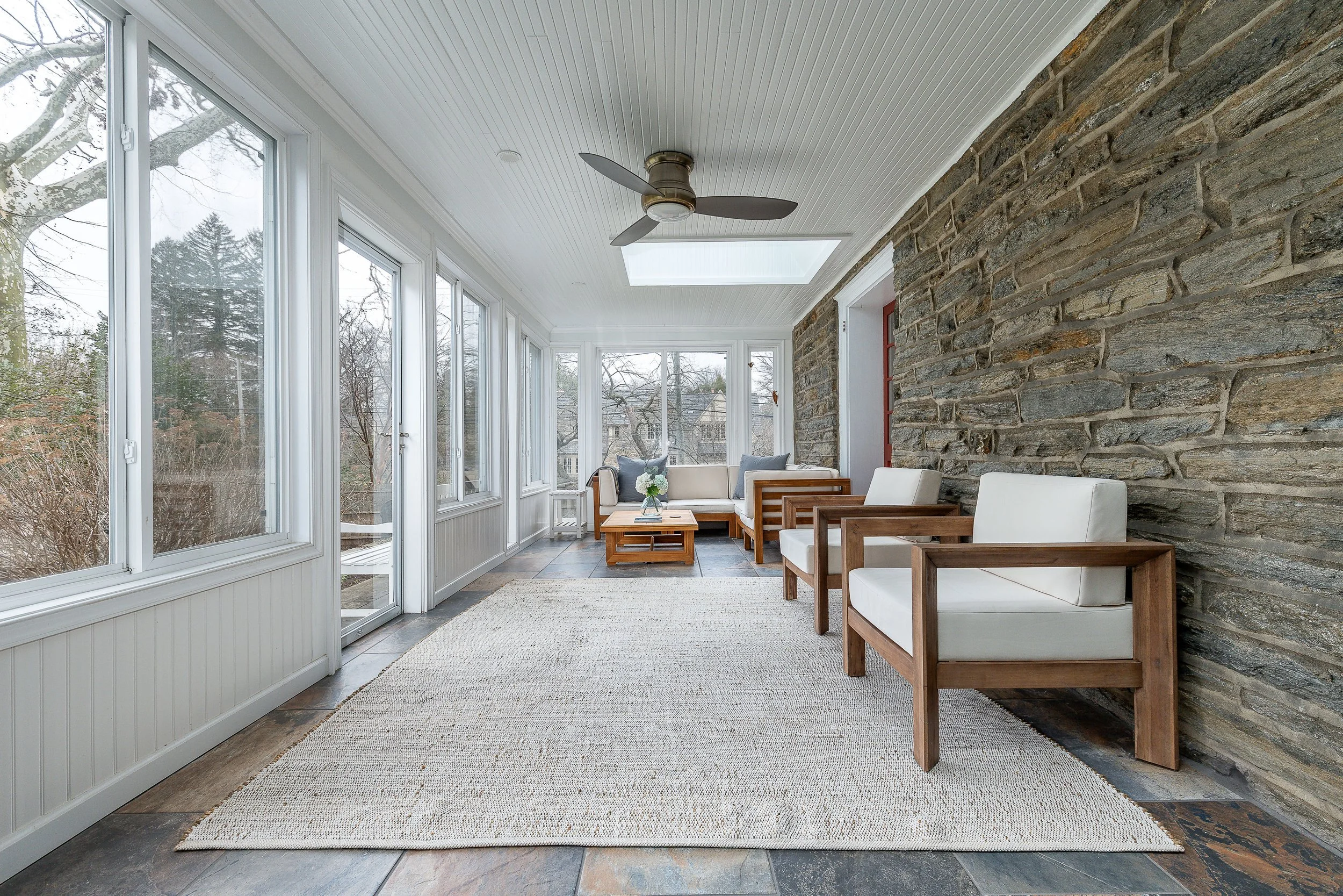 Set on a quiet, elevated lot in one of Wyndmoor’s most desirable locations, this beautifully maintained 1928 center hall stone Colonial offers a rare combination of timeless architecture and thoughtful modern updates. The home blends original character, including detailed millwork, elegant proportions, and a center hall stunning staircase, with meaningful improvements such as zoned heating and central air conditioning. The main level flows effortlessly, featuring a gracious formal living room with fireplace and built-ins, a beautifully proportioned dining room, and a bright enclosed three season room overlooking the garden and yard, creating an ideal space for relaxing or entertaining. The recently updated kitchen features white cabinetry, dark stone counters, a large center island, gas cooking with stainless hood, double wall ovens, and an open, functional layout that flows into a dramatic two story family room with custom built-ins, historic stained glass detail, and direct access to the backyard. A mudroom entry from the driveway connects seamlessly to the home and is complemented by two powder rooms on the first floor. Additional first floor spaces include a spacious laundry room and flexible options for home office or everyday living. The second floor offers a well appointed primary suite with large custom dressing room and a large bath with heated floors, along with two additional large bedrooms and a hall bath, plus a unique loft space overlooking the family room, accessed through a tucked away passage, offering a perfect setting for a reading nook, play space, or quiet retreat. The third floor provides two more bedrooms and a full bath, offering excellent flexibility. The finished lower level adds valuable living space with a recreation area, workout room, workshop, storage, and direct access to the yard. Outside, the property features a patio, level lawn, and thoughtfully designed garden areas including raised beds and a charming spiral garden. A custom oversized four car detached garage with HVAC, Swisstrax flooring, and built-in storage adds versatility for cars, hobbies, or workspace. Located within the highly regarded Springfield Township School District and just minutes from Wyndmoor’s town center, Chestnut Hill, the Wissahickon, and regional rail access to Center City, this is a rare opportunity to own a truly special home.